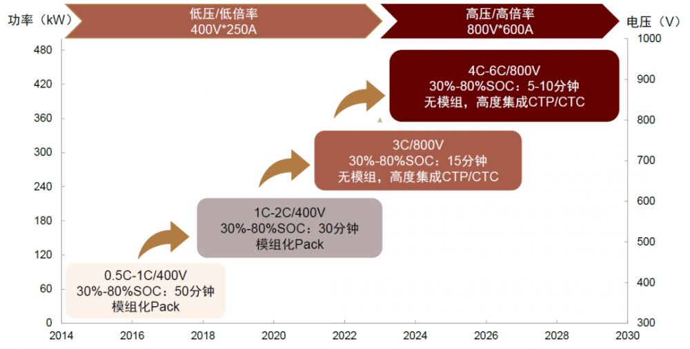 緩解補能焦慮,電動汽車快充步入4C+時代。補能焦慮是制約新能源車滲透率持續提升的關鍵因素之一,而快充技術是緩解補能焦慮的有效途徑。根據《中國高壓快充產業發展報告(2023-2025)》,在電動汽車推廣初期,消費者對充電速度關注不多,電動汽車補能方式以慢充為主,充電倍率在0.5C以下;隨著電動汽車的加速滲透、電池容量的不斷增加,原有補能效率已不能滿足用戶需求,驅動電動汽車充電技術得到突破,充電倍率從1C迅速演進到2C。根據《中國高壓快充產業發展報告(2023-2025)》,由于高倍率快充技術尚不成熟、供應鏈不完善,當前電動汽車的主流充電倍率在1C-2C左右,普遍采用400V電壓平臺,充電功率達到100kW左右,30%-80%SOC平均充電時長在30min及以上,與燃油車不到10min的補能時間相比差距較大。隨著高倍率電芯材料的突破、800V高壓零部件產業鏈的完善以及電池無模組結構帶來冷卻效率的提升,快充技術進一步從2C迭代到4C乃至更高倍率水平,補能效率得到進一步提升,30%-80%SOC充電時長有望壓縮在10min以內。2021年9月,搭載巨灣3C倍率電池的廣汽AION V Plus車型量產。2022年6月,寧德時代發布新款4C倍率麒麟電池,并于1Q23實現量產,電動汽車有望步入4C+超級快充時代。