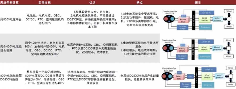 純800V電壓平臺。電池包、電機電控以及充電接口均達到800V,OBC、DC/DC、PTC以及空調壓縮機均重新設計適配,以滿足800V高電壓平臺要求。其優點在于整體設計更安全可靠,體系能量轉換效率更高、利于長期整車成本下降等;缺點在于對電池系統安全要求更高,短期內由于零部件升級車端成本更高。