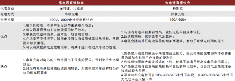 大電流快充:優點在于可以更好地兼容現有充電網絡,改造周期短。缺點在于需要加大線纜的截面積來增加通流能力,由此帶來的充電部件體積和重量的增加會影響用戶操作的便利性,線纜粗細也限制了大電流路徑的上限,使其不能滿足更高倍率的充電需求;同時根據熱力學公式“”,充電電流(I)的增大會導致產熱量過高,從而導致更高的熱損耗和更低的轉化效率,也會對電池熱管理系統造成較大負擔;此外,最大功率充電僅可在10%-30%SOC條件下實現,在30%-90%SOC條件下充電功率會大幅下降。該路徑的應用以特斯拉Model 3為代表,其V3超充樁的充電電壓為400V,最大充電電流超過600A,最大充電功率為250kW,30分鐘可充80%電量。