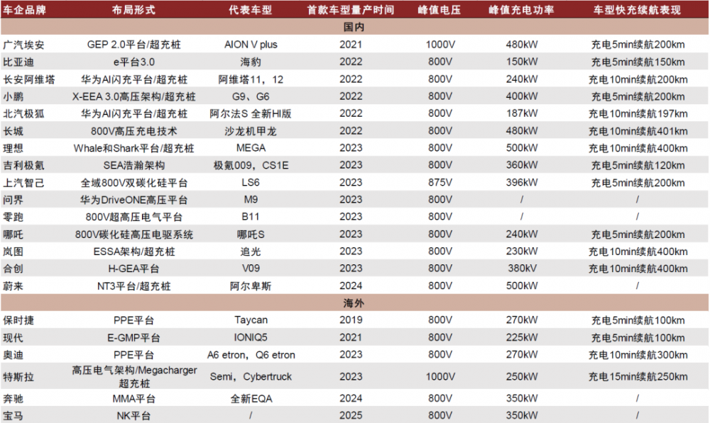 國內:主流車企加速布局高壓快充車型,2023有望成為放量元年。2022年之前市場上僅有廣汽AION V plus等幾款800V車型上市,且受限于樁端功率,無法達到預期峰值充電功率。比亞迪、長安阿維塔、小鵬、北汽極狐、長城、理想、極氪、嵐圖等國內主流車企相繼推出或計劃推出800V高壓平臺以及搭載車型,快充性能基本可達到充電10min續航增加200km以上,2023年有望成為高壓快充車型放量元年。為配套高壓快充車型推廣,小鵬、蔚來、理想、廣汽埃安等車企也以自建超充樁的方式積極推進高壓大功率直流充電樁網絡建設。