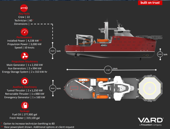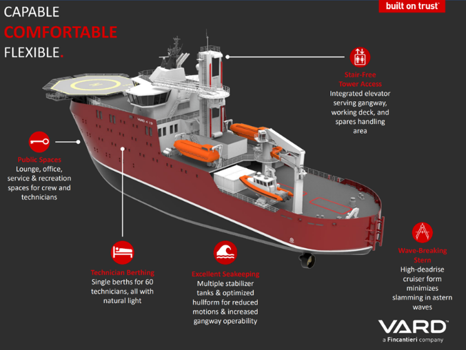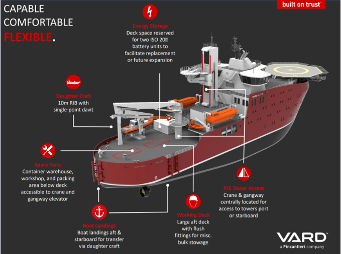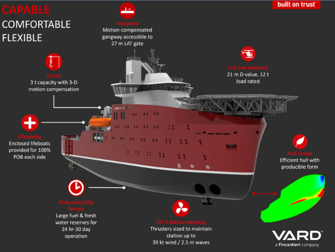 這些船長 287 英尺,可容納 120人。它們將配備的功能包括一個高度可調的運動補償舷梯系統和一個高度可調的船只登陸系統。
